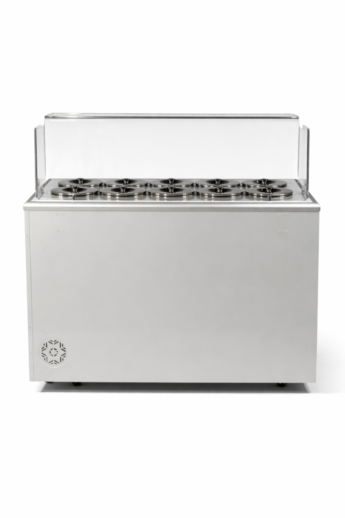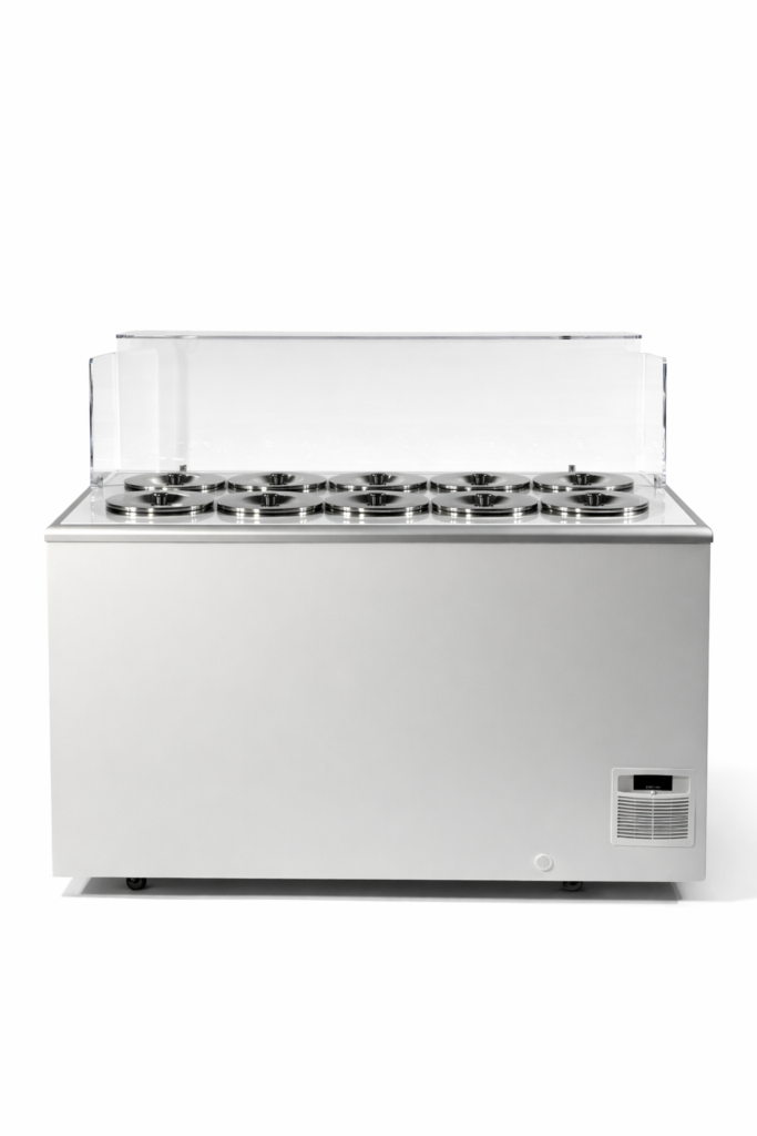 Model 10-komorowy to idealne rozwiązanie stosowane w punktach sprzedaży lodów, zapewniające wygodną organizację pracy i płynność obsługi.