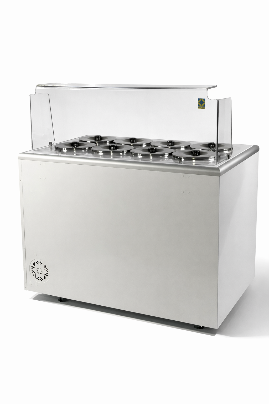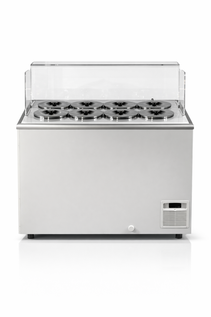 Model 8-komorowy to idealne rozwiązanie stosowane w punktach sprzedaży lodów, zapewniające wygodną organizację pracy i płynność obsługi.